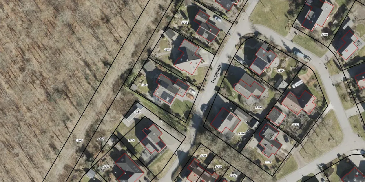 Thujalaan 1 is gelegen op kadastraal perceel ODN00I1308. Deze kadastrale aanduiding is uniek en wordt gebruikt door het Kadaster om eigendomsrechten en andere zakelijke rechten vast te leggen. Het perceel maakt onderdeel uit van de kadastrale gemeente Odoorn.