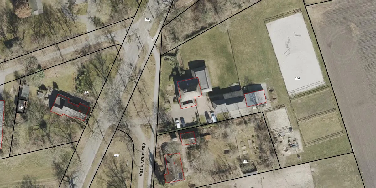Het perceel waarop Valtherzandweg 1 staat heeft een oppervlakte van 5875 m². Dit is een zeer groot perceel. De perceeloppervlakte wordt geregistreerd door het Kadaster. Gedetailleerde informatie over de maten van dit perceel kunt u vinden in het rapport Kadastrale kaart met maatvoering van Valtherzandweg 1.