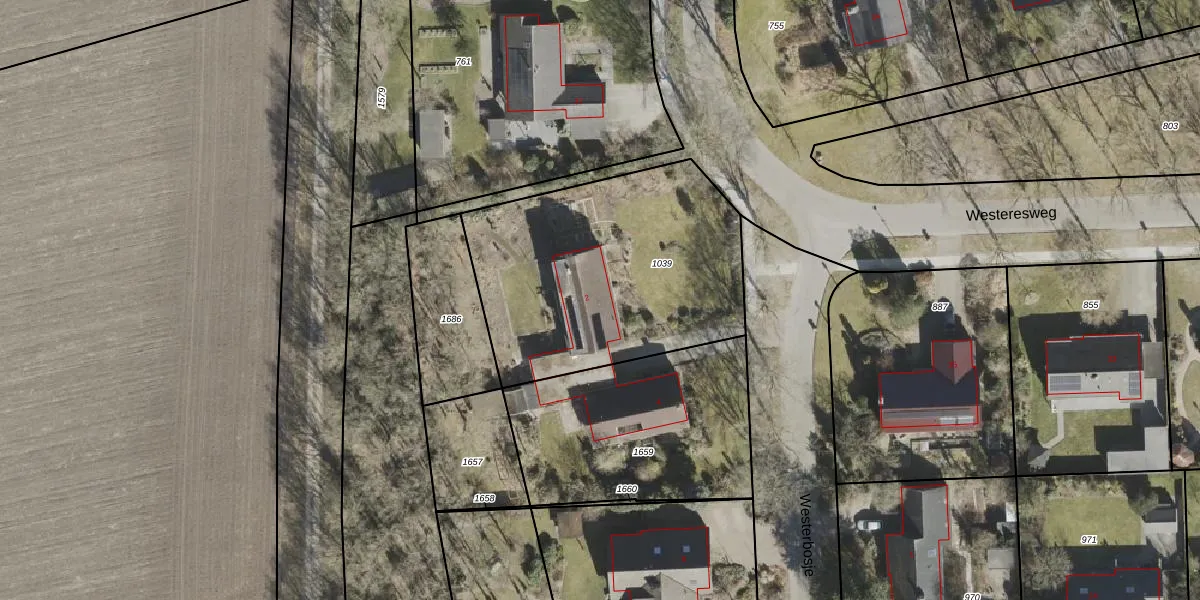 Het perceel waarop Westerbosje 2 staat heeft een oppervlakte van 1305 m². Dit is een zeer groot perceel. De perceeloppervlakte wordt geregistreerd door het Kadaster. Gedetailleerde informatie over de maten van dit perceel kunt u vinden in het rapport Kadastrale kaart met maatvoering van Westerbosje 2.