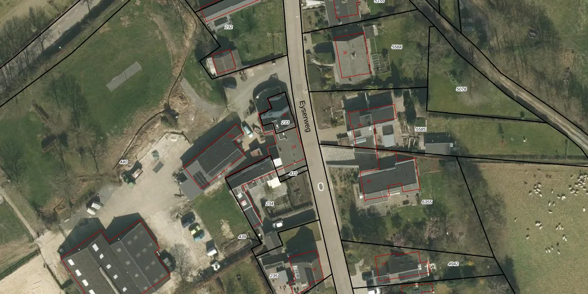 Het perceel waarop Eyserweg 23 staat heeft een oppervlakte van 2,1 ha. Dit is een zeer groot perceel. De perceeloppervlakte wordt geregistreerd door het Kadaster. Gedetailleerde informatie over de maten van dit perceel kunt u vinden in het rapport Kadastrale kaart met maatvoering van Eyserweg 23.