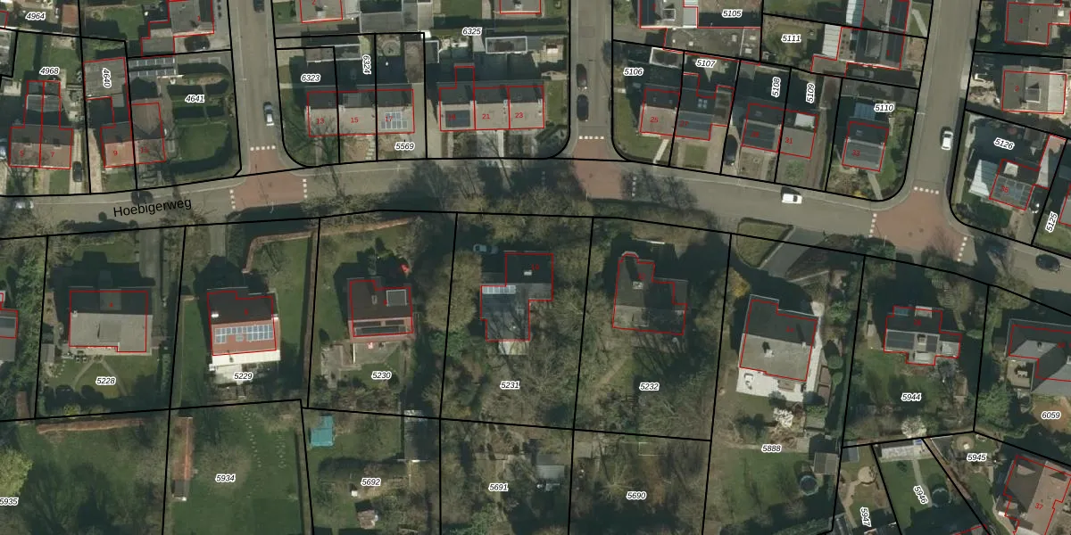 Het perceel waarop Hoebigerweg 10 staat heeft een oppervlakte van 955 m². Dit is een groot perceel. De perceeloppervlakte wordt geregistreerd door het Kadaster. Gedetailleerde informatie over de maten van dit perceel kunt u vinden in het rapport Kadastrale kaart met maatvoering van Hoebigerweg 10.