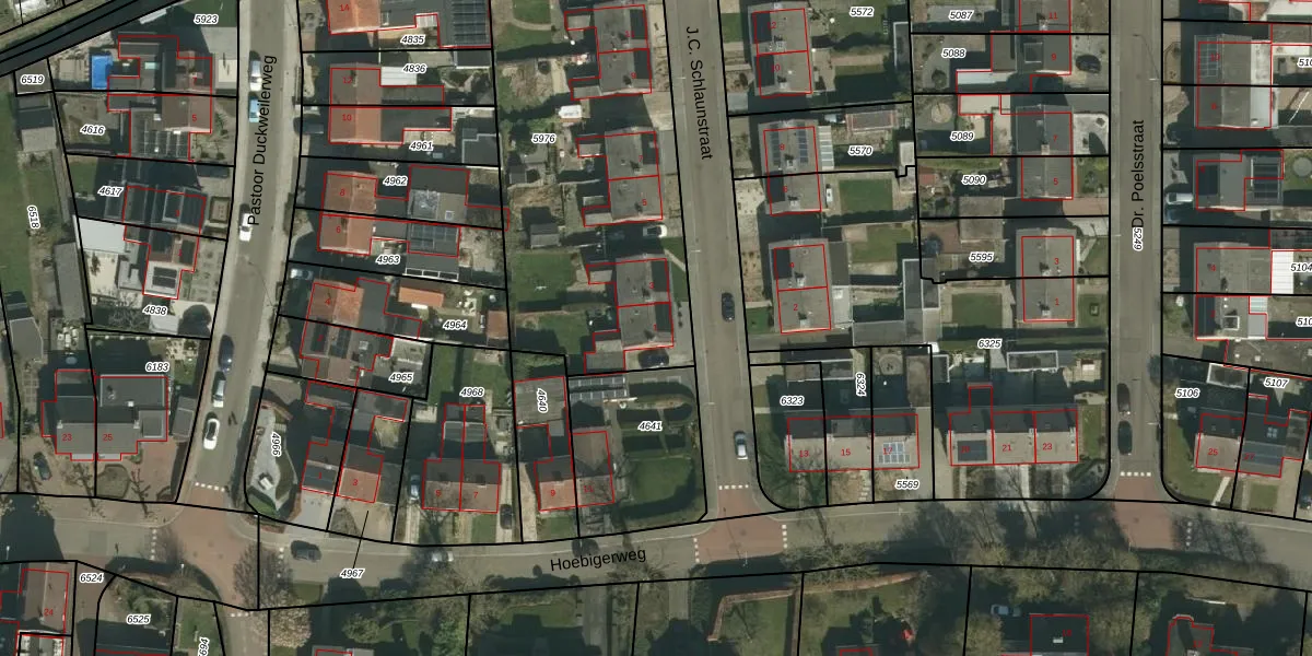 Het perceel waarop J.C. Schlaunstraat 1 staat heeft een oppervlakte van 2260 m². Dit is een zeer groot perceel. De perceeloppervlakte wordt geregistreerd door het Kadaster. Gedetailleerde informatie over de maten van dit perceel kunt u vinden in het rapport Kadastrale kaart met maatvoering van J.C. Schlaunstraat 1.