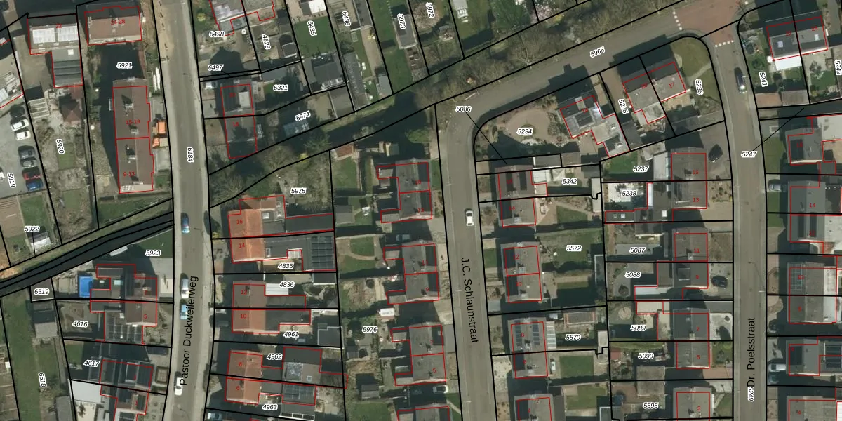 Het perceel waarop J.C. Schlaunstraat 13 staat heeft een oppervlakte van 2260 m². Dit is een zeer groot perceel. De perceeloppervlakte wordt geregistreerd door het Kadaster. Gedetailleerde informatie over de maten van dit perceel kunt u vinden in het rapport Kadastrale kaart met maatvoering van J.C. Schlaunstraat 13.