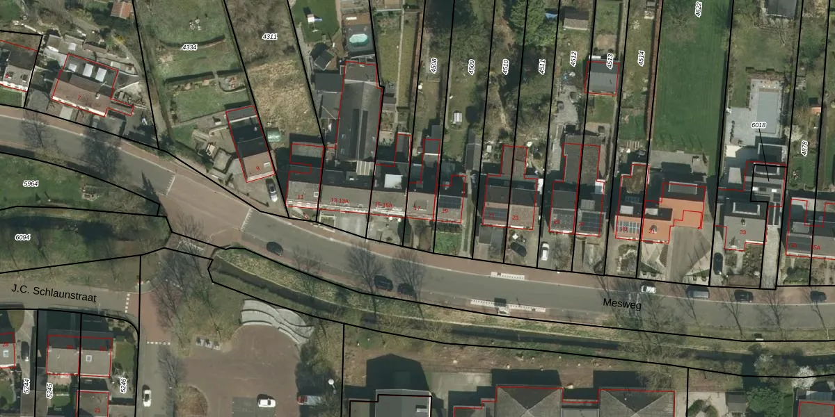 Het perceel waarop Mesweg 17 staat heeft een oppervlakte van 523 m². Dit is een groot perceel. De perceeloppervlakte wordt geregistreerd door het Kadaster. Gedetailleerde informatie over de maten van dit perceel kunt u vinden in het rapport Kadastrale kaart met maatvoering van Mesweg 17.