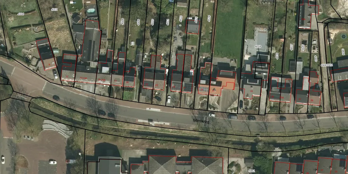Het perceel waarop Mesweg 25 staat heeft een oppervlakte van 675 m². Dit is een groot perceel. De perceeloppervlakte wordt geregistreerd door het Kadaster. Gedetailleerde informatie over de maten van dit perceel kunt u vinden in het rapport Kadastrale kaart met maatvoering van Mesweg 25.