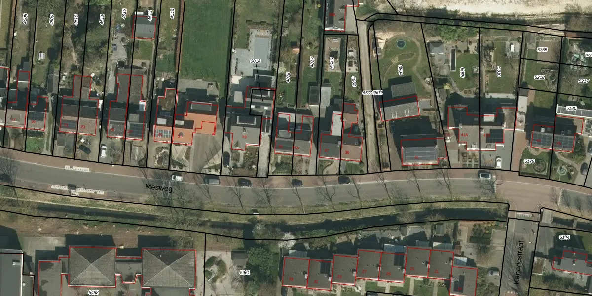 Het perceel waarop Mesweg 35-A staat heeft een oppervlakte van 665 m². Dit is een groot perceel. De perceeloppervlakte wordt geregistreerd door het Kadaster. Gedetailleerde informatie over de maten van dit perceel kunt u vinden in het rapport Kadastrale kaart met maatvoering van Mesweg 35-A.