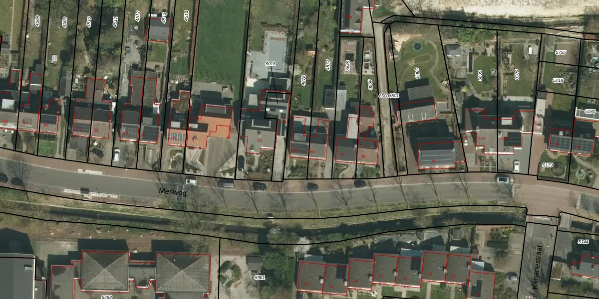 Het perceel waarop Mesweg 35 staat heeft een oppervlakte van 700 m². Dit is een groot perceel. De perceeloppervlakte wordt geregistreerd door het Kadaster. Gedetailleerde informatie over de maten van dit perceel kunt u vinden in het rapport Kadastrale kaart met maatvoering van Mesweg 35.