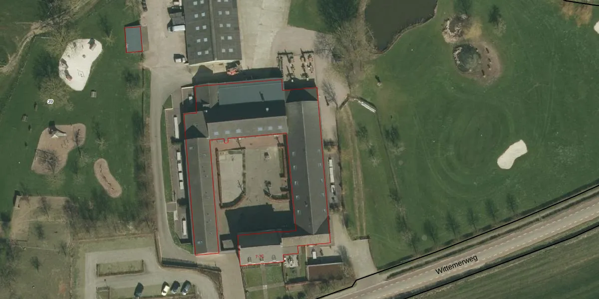 Het perceel waarop Wittemerweg 7-C staat heeft een oppervlakte van 4,1 ha. Dit is een zeer groot perceel. De perceeloppervlakte wordt geregistreerd door het Kadaster. Gedetailleerde informatie over de maten van dit perceel kunt u vinden in het rapport Kadastrale kaart met maatvoering van Wittemerweg 7-C.