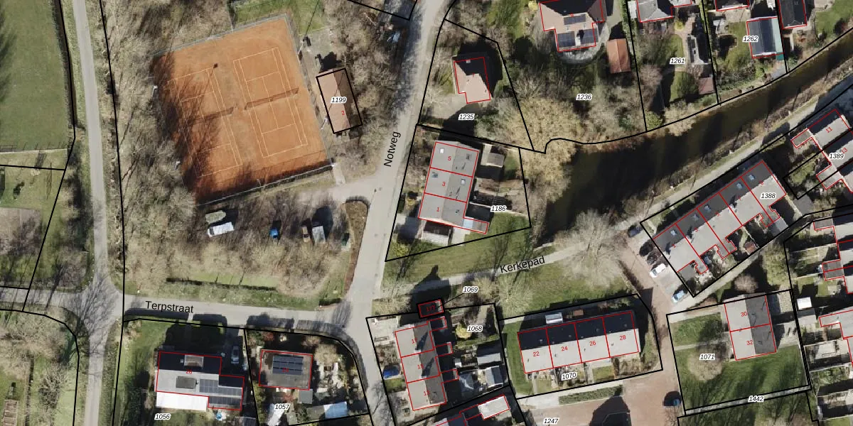 Het perceel waarop Notweg 1 staat heeft een oppervlakte van 736 m². Dit is een groot perceel. De perceeloppervlakte wordt geregistreerd door het Kadaster. Gedetailleerde informatie over de maten van dit perceel kunt u vinden in het rapport Kadastrale kaart met maatvoering van Notweg 1.
