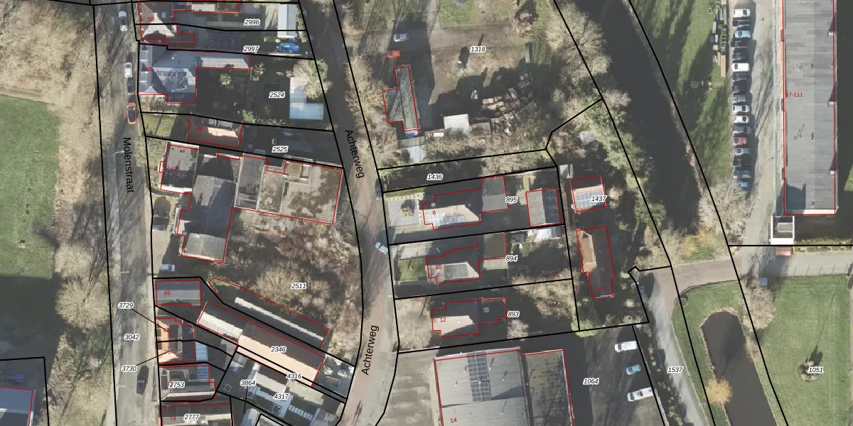 Het perceel waarop Achterweg 8 staat heeft een oppervlakte van 523 m². Dit is een groot perceel. De perceeloppervlakte wordt geregistreerd door het Kadaster. Gedetailleerde informatie over de maten van dit perceel kunt u vinden in het rapport Kadastrale kaart met maatvoering van Achterweg 8.