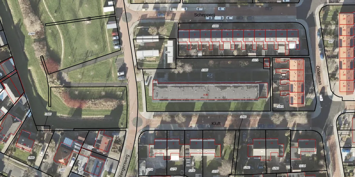 Het perceel waarop Kluft 20 staat heeft een oppervlakte van 1998 m². Dit is een zeer groot perceel. De perceeloppervlakte wordt geregistreerd door het Kadaster. Gedetailleerde informatie over de maten van dit perceel kunt u vinden in het rapport Kadastrale kaart met maatvoering van Kluft 20.