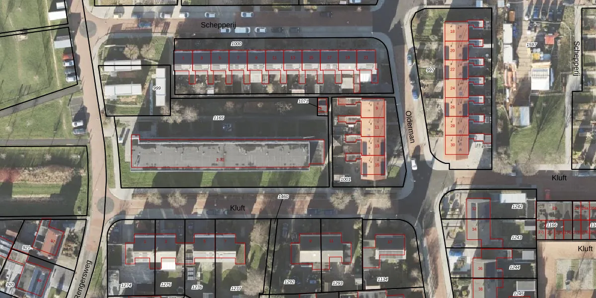 Het perceel waarop Kluft 32 staat heeft een oppervlakte van 1998 m². Dit is een zeer groot perceel. De perceeloppervlakte wordt geregistreerd door het Kadaster. Gedetailleerde informatie over de maten van dit perceel kunt u vinden in het rapport Kadastrale kaart met maatvoering van Kluft 32.