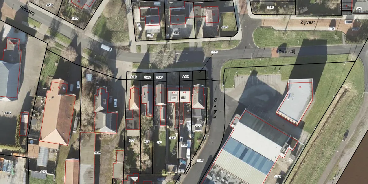 Proosdij 45 is gelegen op kadastraal perceel DZL01L1019. Deze kadastrale aanduiding is uniek en wordt gebruikt door het Kadaster om eigendomsrechten en andere zakelijke rechten vast te leggen. Het perceel maakt onderdeel uit van de kadastrale gemeente Delfzijl.