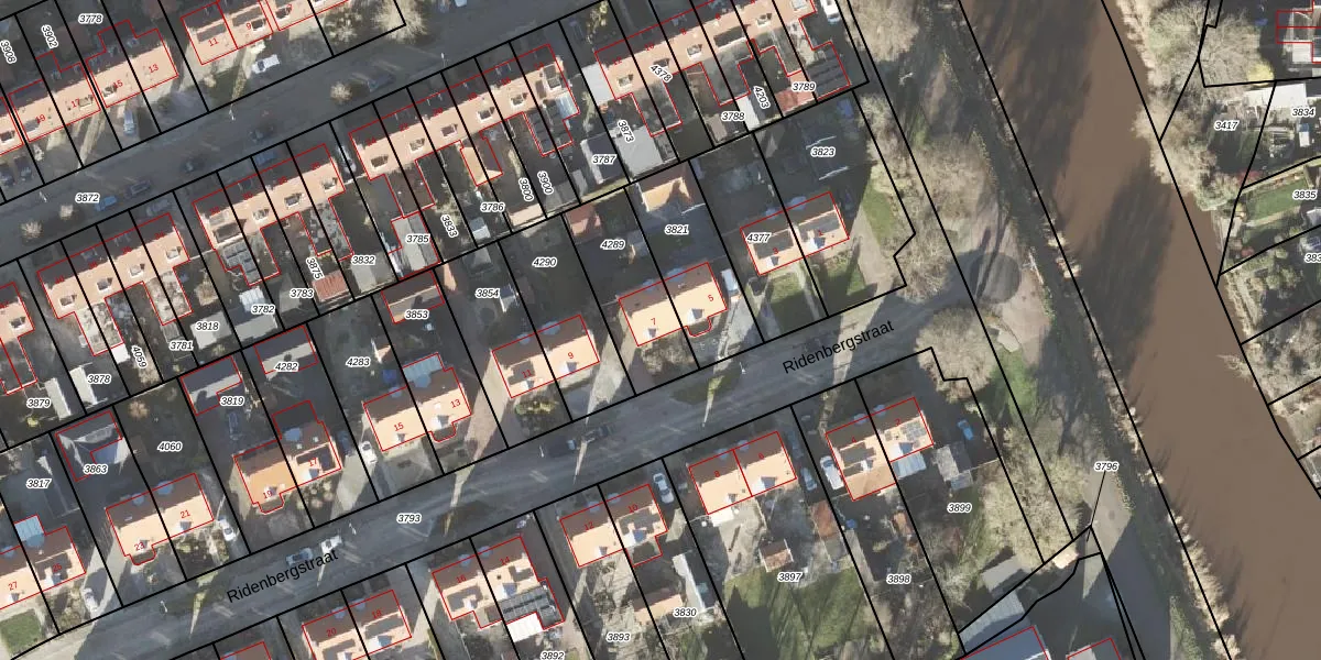 Het perceel waarop Ridenbergstraat 7 staat heeft een oppervlakte van 308 m². Dit is een groot perceel. De perceeloppervlakte wordt geregistreerd door het Kadaster. Gedetailleerde informatie over de maten van dit perceel kunt u vinden in het rapport Kadastrale kaart met maatvoering van Ridenbergstraat 7.