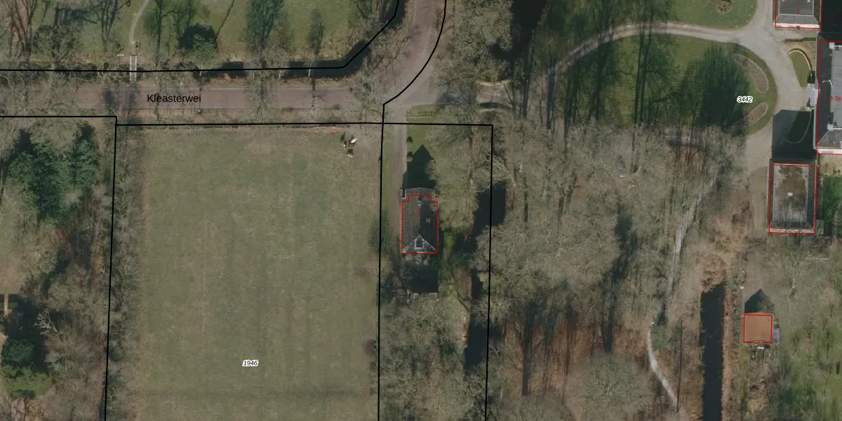 Het perceel waarop Kleasterwei 5 staat heeft een oppervlakte van 15,4 ha. Dit is een zeer groot perceel. De perceeloppervlakte wordt geregistreerd door het Kadaster. Gedetailleerde informatie over de maten van dit perceel kunt u vinden in het rapport Kadastrale kaart met maatvoering van Kleasterwei 5.