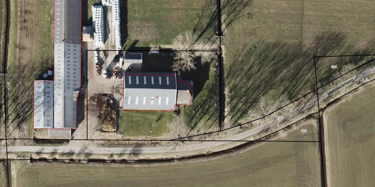 Meedenerweg 21 is gelegen op kadastraal perceel EZG00F416. Deze kadastrale aanduiding is uniek en wordt gebruikt door het Kadaster om eigendomsrechten en andere zakelijke rechten vast te leggen. Het perceel maakt onderdeel uit van de kadastrale gemeente Ezinge.