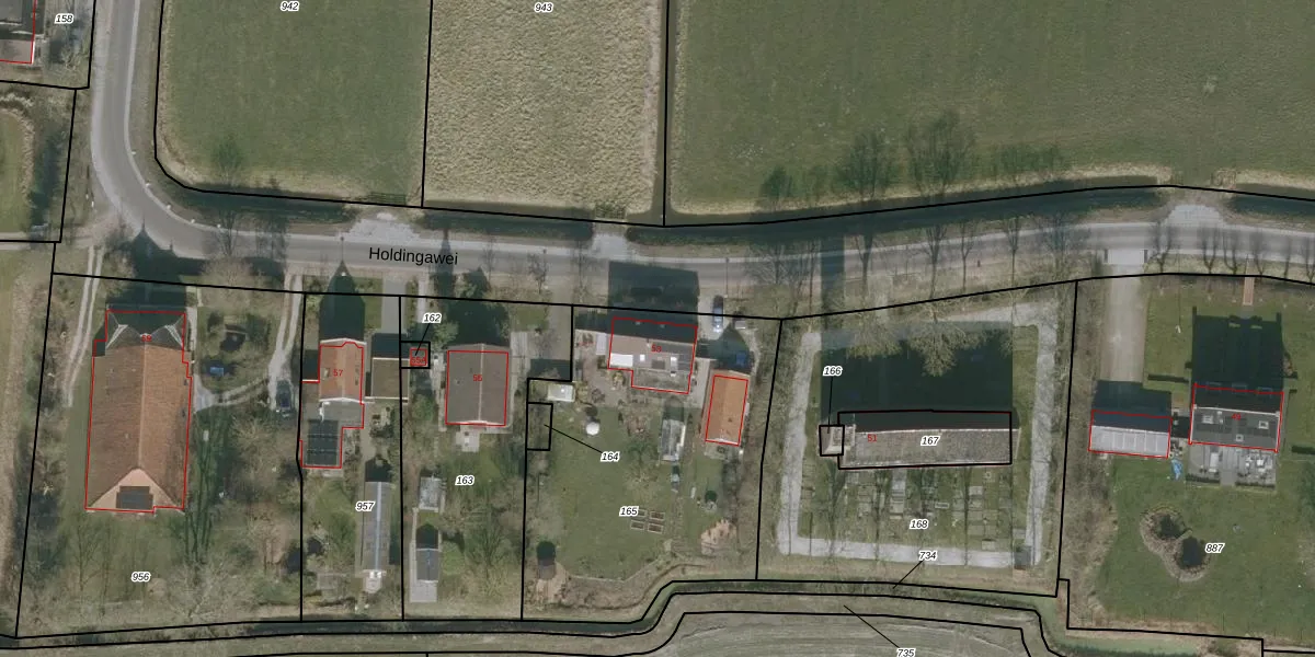 Het perceel waarop Holdingawei 53 staat heeft een oppervlakte van 1563 m². Dit is een zeer groot perceel. De perceeloppervlakte wordt geregistreerd door het Kadaster. Gedetailleerde informatie over de maten van dit perceel kunt u vinden in het rapport Kadastrale kaart met maatvoering van Holdingawei 53.
