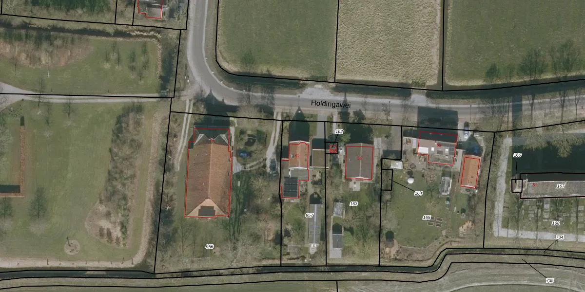 Het perceel waarop Holdingawei 57 staat heeft een oppervlakte van 755 m². Dit is een groot perceel. De perceeloppervlakte wordt geregistreerd door het Kadaster. Gedetailleerde informatie over de maten van dit perceel kunt u vinden in het rapport Kadastrale kaart met maatvoering van Holdingawei 57.