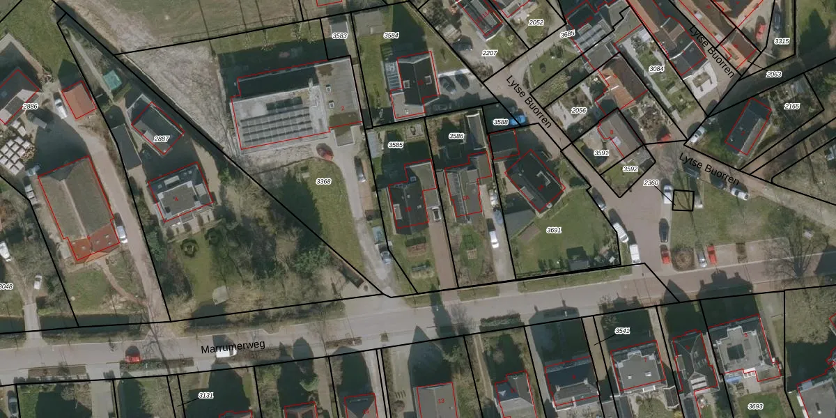 Het perceel waarop Marrumerweg 2-B staat heeft een oppervlakte van 575 m². Dit is een groot perceel. De perceeloppervlakte wordt geregistreerd door het Kadaster. Gedetailleerde informatie over de maten van dit perceel kunt u vinden in het rapport Kadastrale kaart met maatvoering van Marrumerweg 2-B.