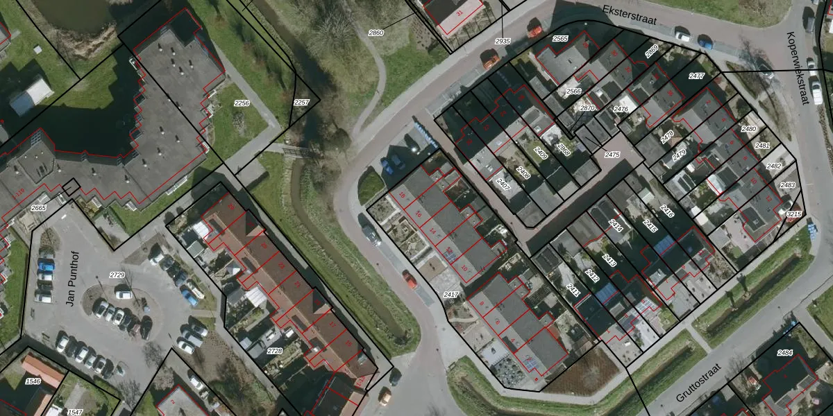 Het perceel waarop Eksterstraat 16 staat heeft een oppervlakte van 1410 m². Dit is een zeer groot perceel. De perceeloppervlakte wordt geregistreerd door het Kadaster. Gedetailleerde informatie over de maten van dit perceel kunt u vinden in het rapport Kadastrale kaart met maatvoering van Eksterstraat 16.