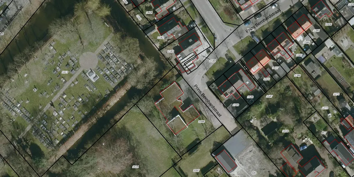 Het perceel waarop Prins Bernhardstraat 16 staat heeft een oppervlakte van 1243 m². Dit is een zeer groot perceel. De perceeloppervlakte wordt geregistreerd door het Kadaster. Gedetailleerde informatie over de maten van dit perceel kunt u vinden in het rapport Kadastrale kaart met maatvoering van Prins Bernhardstraat 16.