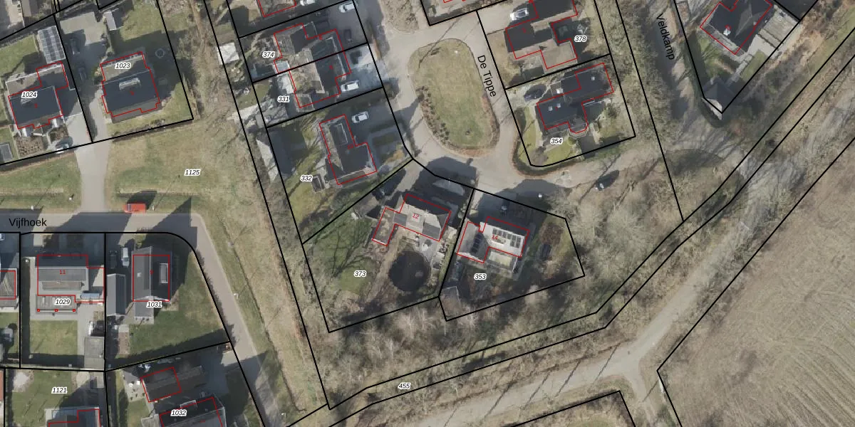 Het perceel waarop De Tippe 12 staat heeft een oppervlakte van 961 m². Dit is een groot perceel. De perceeloppervlakte wordt geregistreerd door het Kadaster. Gedetailleerde informatie over de maten van dit perceel kunt u vinden in het rapport Kadastrale kaart met maatvoering van De Tippe 12.