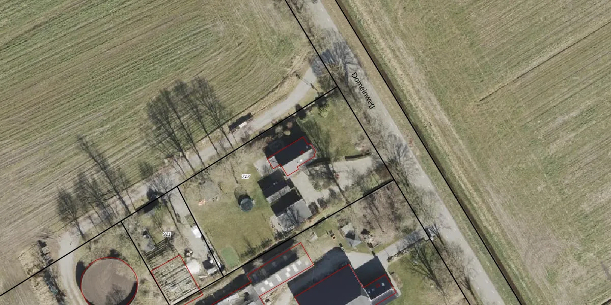 Het perceel waarop Domeinweg 15 staat heeft een oppervlakte van 2179 m². Dit is een zeer groot perceel. De perceeloppervlakte wordt geregistreerd door het Kadaster. Gedetailleerde informatie over de maten van dit perceel kunt u vinden in het rapport Kadastrale kaart met maatvoering van Domeinweg 15.