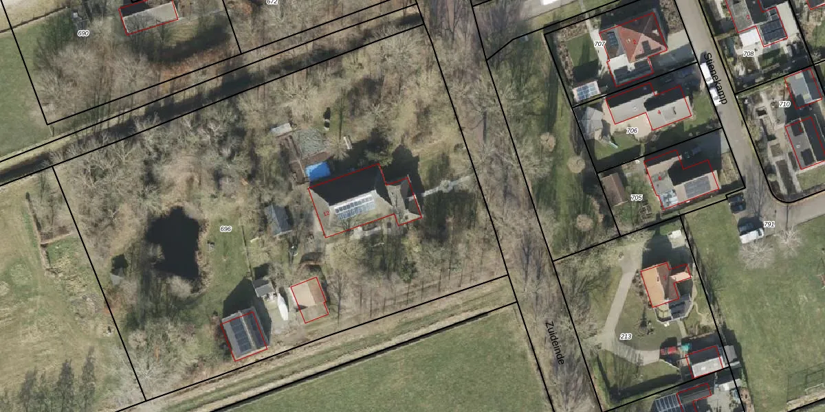 Zuideinde 12 is gelegen op kadastraal perceel OTW02F696. Deze kadastrale aanduiding is uniek en wordt gebruikt door het Kadaster om eigendomsrechten en andere zakelijke rechten vast te leggen. Het perceel maakt onderdeel uit van de kadastrale gemeente Oosterwolde.