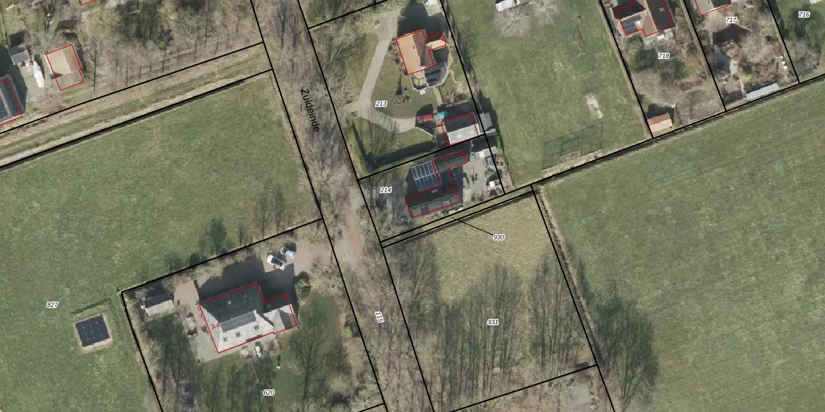 Zuideinde 9 is gelegen op kadastraal perceel OTW02F214. Deze kadastrale aanduiding is uniek en wordt gebruikt door het Kadaster om eigendomsrechten en andere zakelijke rechten vast te leggen. Het perceel maakt onderdeel uit van de kadastrale gemeente Oosterwolde.