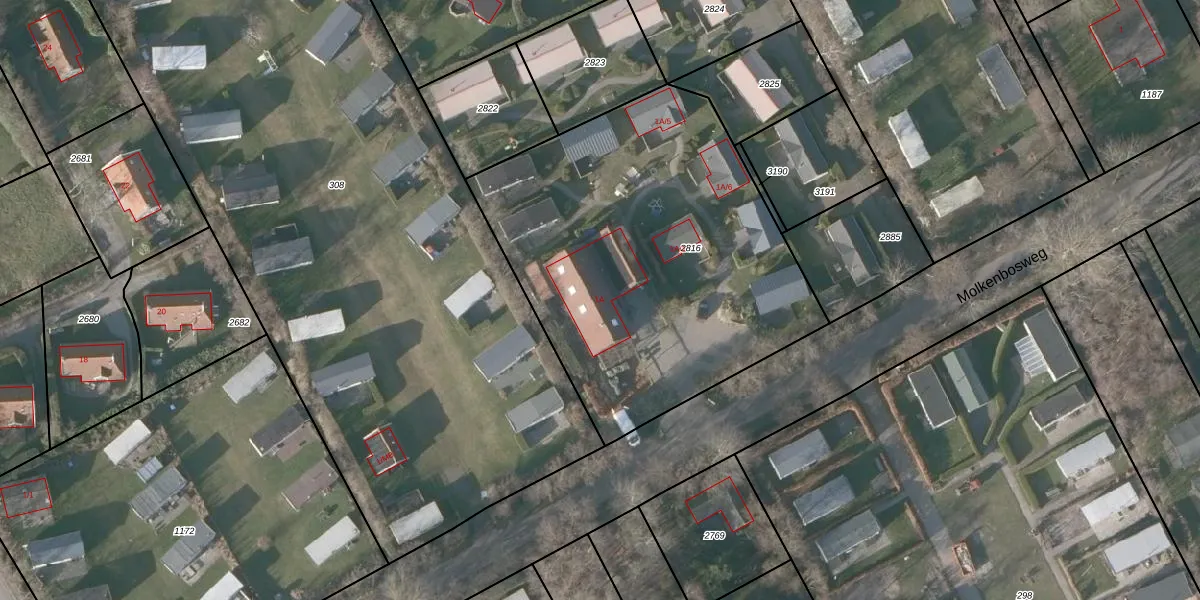 Het perceel waarop Molkenbosweg 1-A staat heeft een oppervlakte van 2065 m². Dit is een zeer groot perceel. De perceeloppervlakte wordt geregistreerd door het Kadaster. Gedetailleerde informatie over de maten van dit perceel kunt u vinden in het rapport Kadastrale kaart met maatvoering van Molkenbosweg 1-A.