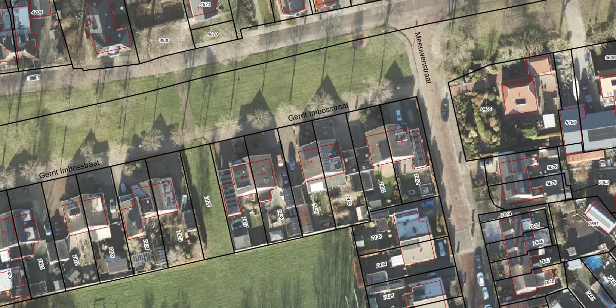 Het perceel waarop Gerrit Imbosstraat 7-d staat heeft een oppervlakte van 414 m². Dit is een groot perceel. De perceeloppervlakte wordt geregistreerd door het Kadaster. Gedetailleerde informatie over de maten van dit perceel kunt u vinden in het rapport Kadastrale kaart met maatvoering van Gerrit Imbosstraat 7-d.