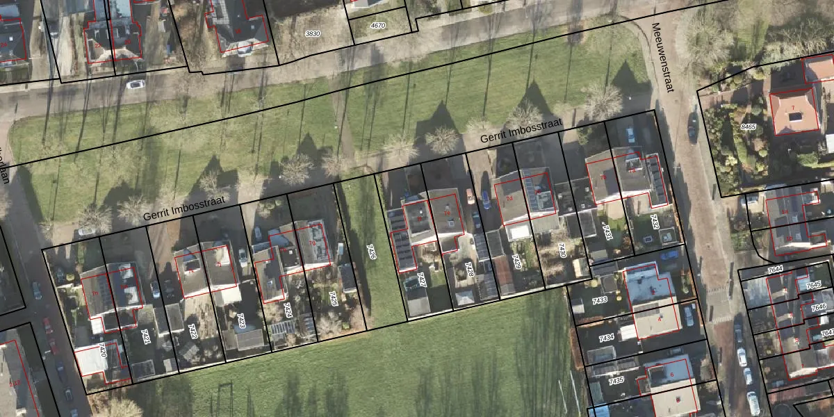 Het perceel waarop Gerrit Imbosstraat 7-f staat heeft een oppervlakte van 415 m². Dit is een groot perceel. De perceeloppervlakte wordt geregistreerd door het Kadaster. Gedetailleerde informatie over de maten van dit perceel kunt u vinden in het rapport Kadastrale kaart met maatvoering van Gerrit Imbosstraat 7-f.