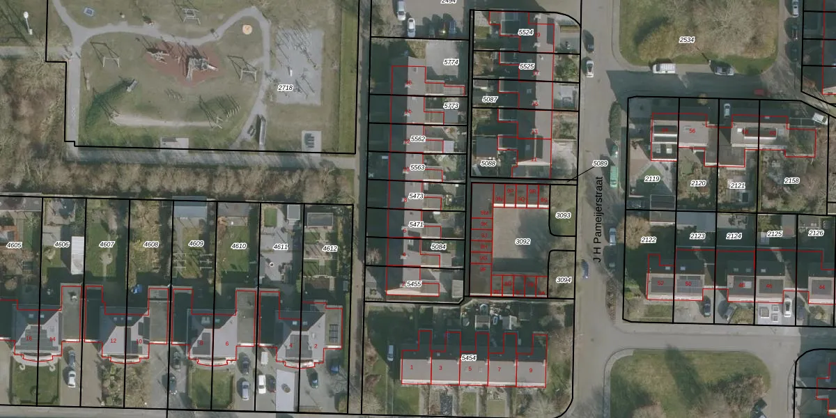 Gebruik de zoekbalk of klik op een perceel voor informatie over de adressen binnen dit perceel.