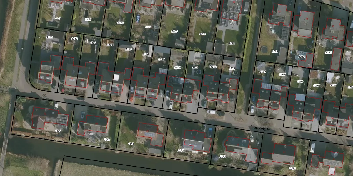 Het perceel waarop Duukelaar 34 staat heeft een oppervlakte van 350 m². Dit is een groot perceel. De perceeloppervlakte wordt geregistreerd door het Kadaster. Gedetailleerde informatie over de maten van dit perceel kunt u vinden in het rapport Kadastrale kaart met maatvoering van Duukelaar 34.