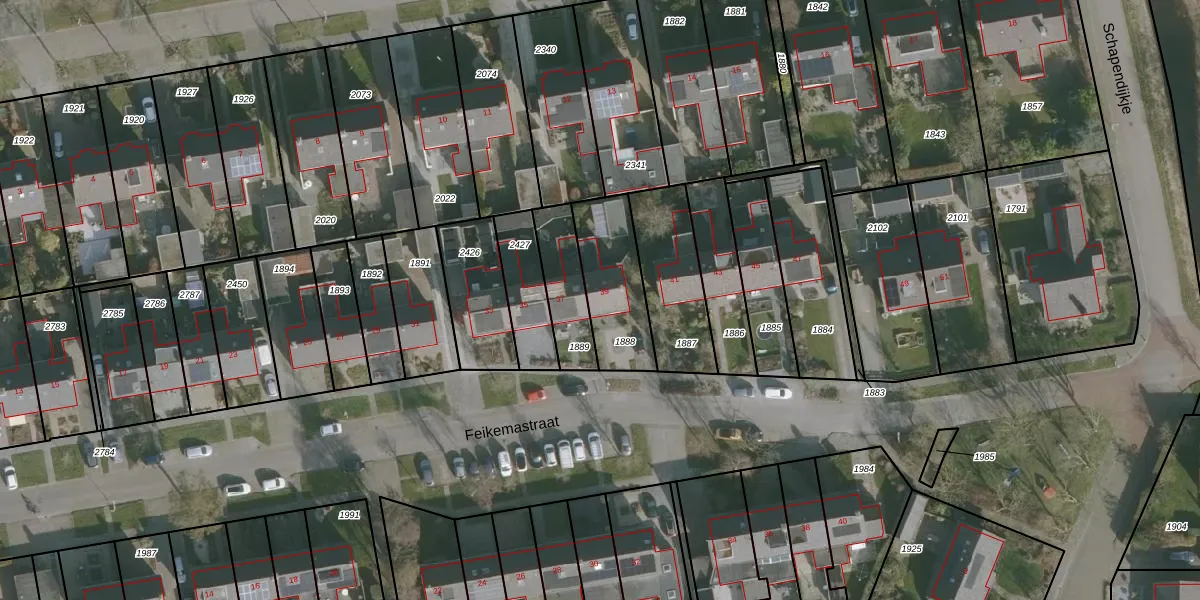 Het perceel waarop Feikemastraat 39 staat heeft een oppervlakte van 282 m². Dit is een middelgroot perceel. De perceeloppervlakte wordt geregistreerd door het Kadaster. Gedetailleerde informatie over de maten van dit perceel kunt u vinden in het rapport Kadastrale kaart met maatvoering van Feikemastraat 39.