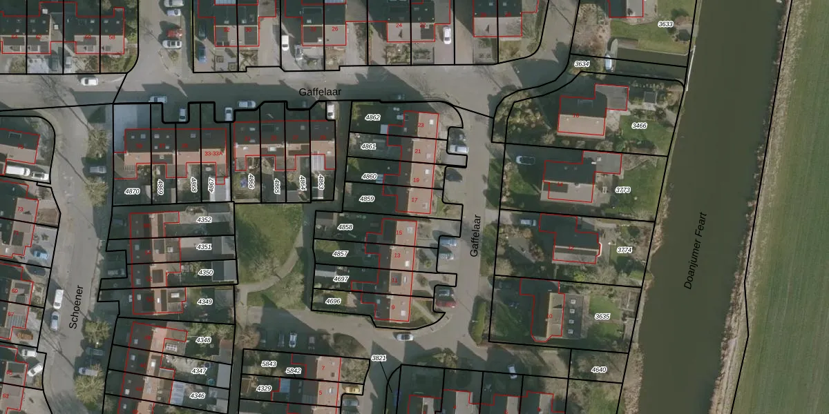 Gaffelaar 17 is gelegen op kadastraal perceel FNK00B4859. Deze kadastrale aanduiding is uniek en wordt gebruikt door het Kadaster om eigendomsrechten en andere zakelijke rechten vast te leggen. Het perceel maakt onderdeel uit van de kadastrale gemeente Franeker.