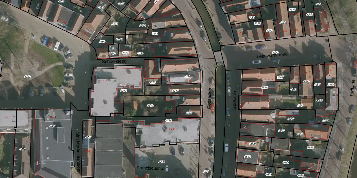 Het perceel waarop het adres ligt is FNK00-A-3147. De afkorting 'FNK00' staat voor kadastrale gemeente Franeker. De gemiddelde perceelgrootte in Franeker is 2404,51 m². Dit perceel is kleiner: de perceeloppervlakte bedraagt 189 m². Het kleinste perceel in de kadastrale gemeente is 0 m² groot. De grootste perceeloppervlakte is 30,5 ha. Op het perceel bevinden zich geen andere adressen. In de Basisregistratie Kadaster (BRK) werden de grenzen van het perceel geregistreerd op 12-10-2023.