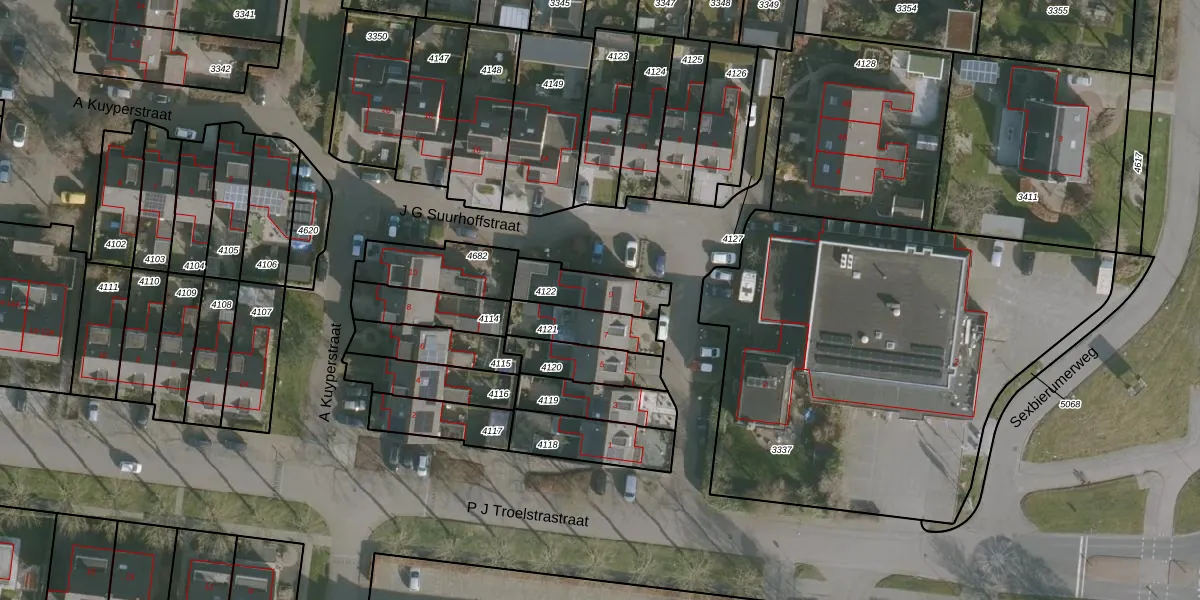 Gebruik de zoekbalk of klik op een perceel voor informatie over de adressen binnen dit perceel.