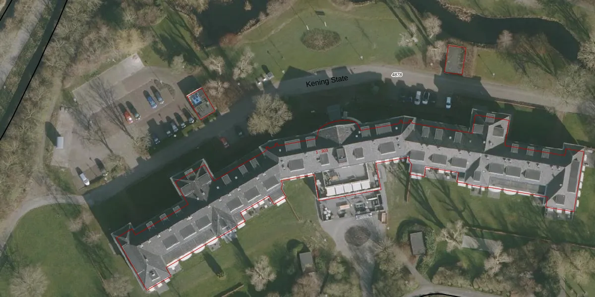 Het perceel waarop Kening State 32 staat heeft een oppervlakte van 3,3 ha. Dit is een zeer groot perceel. De perceeloppervlakte wordt geregistreerd door het Kadaster. Gedetailleerde informatie over de maten van dit perceel kunt u vinden in het rapport Kadastrale kaart met maatvoering van Kening State 32.