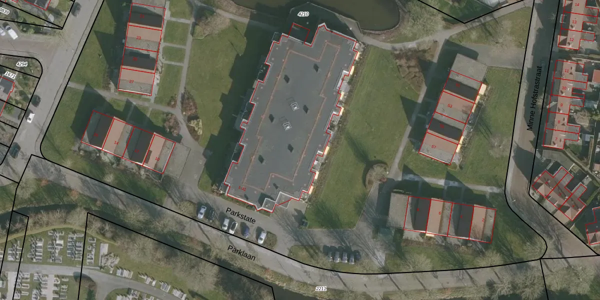 Het perceel waarop Parkstate 13 staat heeft een oppervlakte van 1,5 ha. Dit is een zeer groot perceel. De perceeloppervlakte wordt geregistreerd door het Kadaster. Gedetailleerde informatie over de maten van dit perceel kunt u vinden in het rapport Kadastrale kaart met maatvoering van Parkstate 13.
