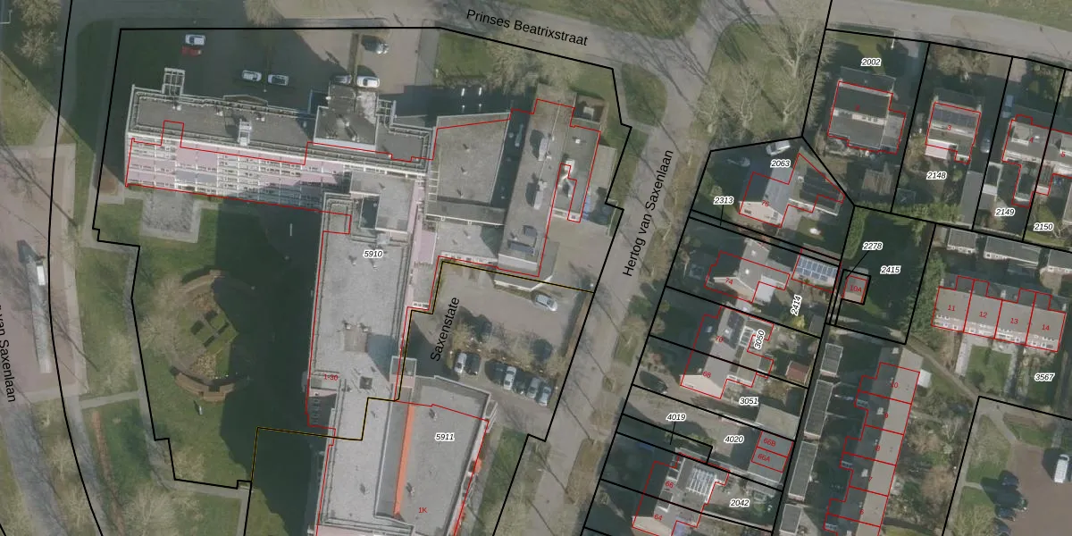Het perceel waarop Prinses Beatrixstraat 1-K-005 staat heeft een oppervlakte van 5823 m². Dit is een zeer groot perceel. De perceeloppervlakte wordt geregistreerd door het Kadaster. Gedetailleerde informatie over de maten van dit perceel kunt u vinden in het rapport Kadastrale kaart met maatvoering van Prinses Beatrixstraat 1-K-005.