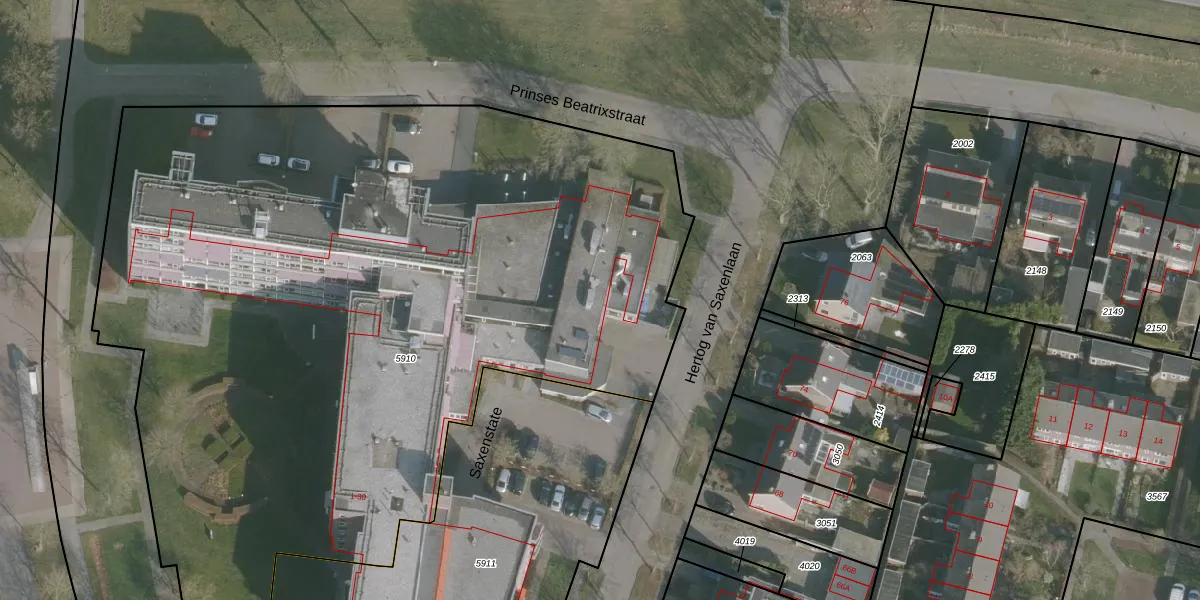 Het perceel waarop Prinses Beatrixstraat 1-K-103 staat heeft een oppervlakte van 5823 m². Dit is een zeer groot perceel. De perceeloppervlakte wordt geregistreerd door het Kadaster. Gedetailleerde informatie over de maten van dit perceel kunt u vinden in het rapport Kadastrale kaart met maatvoering van Prinses Beatrixstraat 1-K-103.