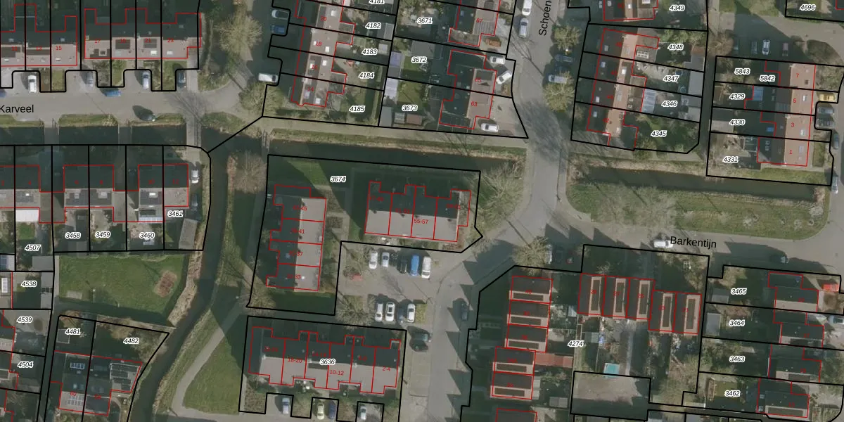 Het perceel waarop Schoener 55 staat heeft een oppervlakte van 1312 m². Dit is een zeer groot perceel. De perceeloppervlakte wordt geregistreerd door het Kadaster. Gedetailleerde informatie over de maten van dit perceel kunt u vinden in het rapport Kadastrale kaart met maatvoering van Schoener 55.
