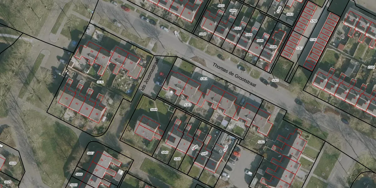 Het perceel waarop Thomas de Grootstraat 9 staat heeft een oppervlakte van 1219 m². Dit is een zeer groot perceel. De perceeloppervlakte wordt geregistreerd door het Kadaster. Gedetailleerde informatie over de maten van dit perceel kunt u vinden in het rapport Kadastrale kaart met maatvoering van Thomas de Grootstraat 9.