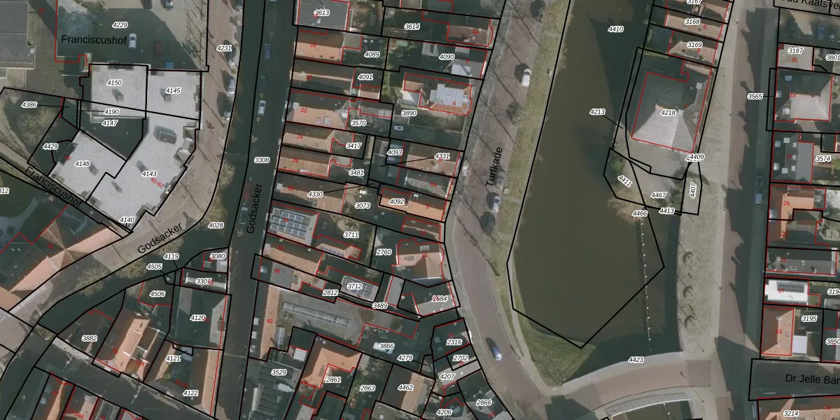 Turfkade 9 is gelegen op kadastraal perceel FNK00A4092. Deze kadastrale aanduiding is uniek en wordt gebruikt door het Kadaster om eigendomsrechten en andere zakelijke rechten vast te leggen. Het perceel maakt onderdeel uit van de kadastrale gemeente Franeker.