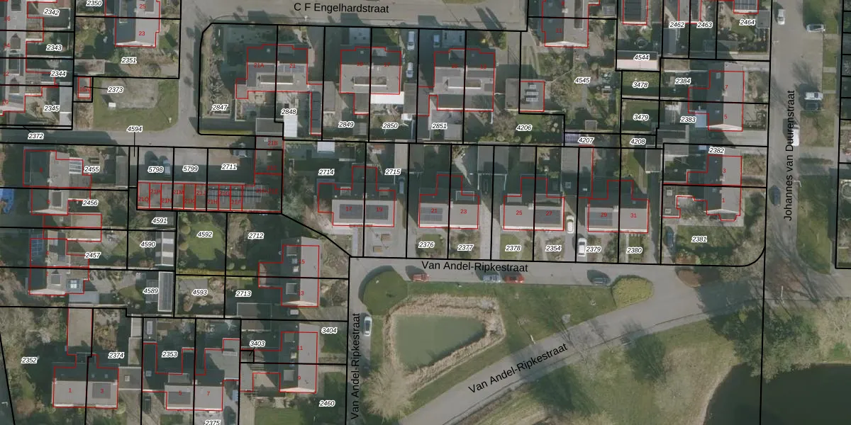 Van Andel-Ripkestraat 21 is gelegen op kadastraal perceel FNK00B2376. Deze kadastrale aanduiding is uniek en wordt gebruikt door het Kadaster om eigendomsrechten en andere zakelijke rechten vast te leggen. Het perceel maakt onderdeel uit van de kadastrale gemeente Franeker.