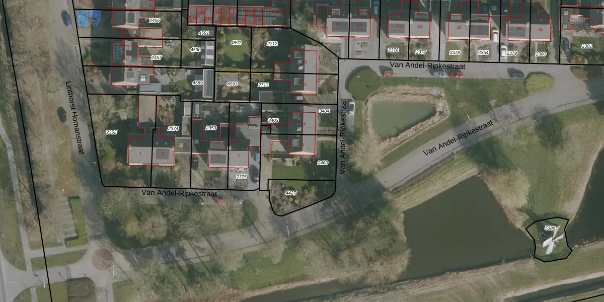 Van Andel-Ripkestraat 9 is gelegen op kadastraal perceel FNK00B2460. Deze kadastrale aanduiding is uniek en wordt gebruikt door het Kadaster om eigendomsrechten en andere zakelijke rechten vast te leggen. Het perceel maakt onderdeel uit van de kadastrale gemeente Franeker.