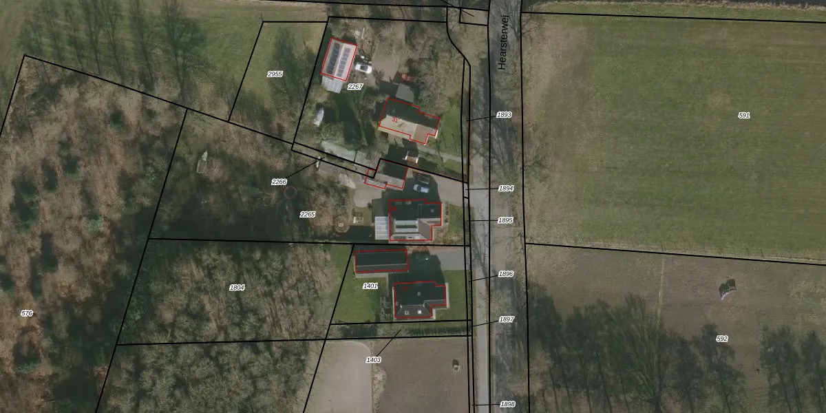 Het perceel waarop Hearsterwei 29 staat heeft een oppervlakte van 1566 m². Dit is een zeer groot perceel. De perceeloppervlakte wordt geregistreerd door het Kadaster. Gedetailleerde informatie over de maten van dit perceel kunt u vinden in het rapport Kadastrale kaart met maatvoering van Hearsterwei 29.