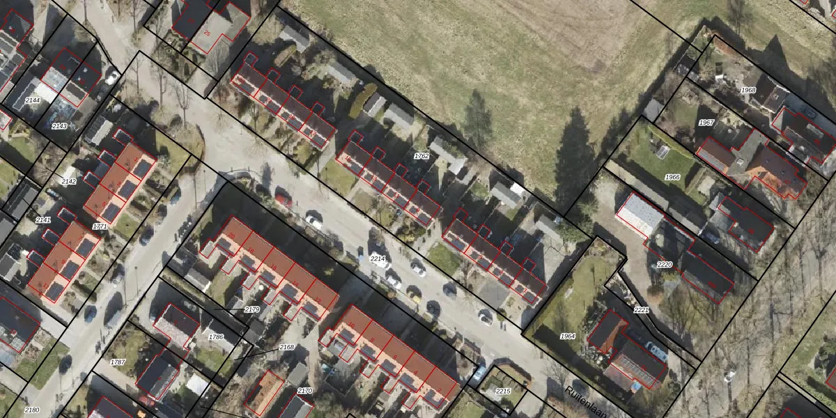 Het perceel waarop Ruitenlaan 9 staat heeft een oppervlakte van 2595 m². Dit is een zeer groot perceel. De perceeloppervlakte wordt geregistreerd door het Kadaster. Gedetailleerde informatie over de maten van dit perceel kunt u vinden in het rapport Kadastrale kaart met maatvoering van Ruitenlaan 9.