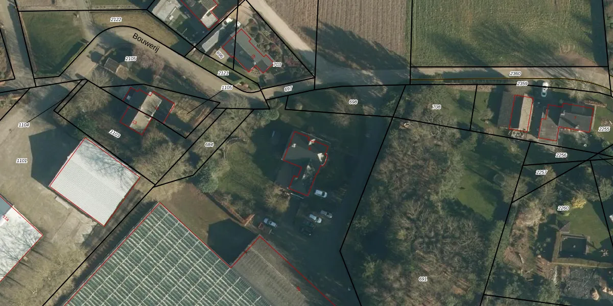 Het perceel waarop Bouwerij 9 staat heeft een oppervlakte van 2,5 ha. Dit is een zeer groot perceel. De perceeloppervlakte wordt geregistreerd door het Kadaster. Gedetailleerde informatie over de maten van dit perceel kunt u vinden in het rapport Kadastrale kaart met maatvoering van Bouwerij 9.